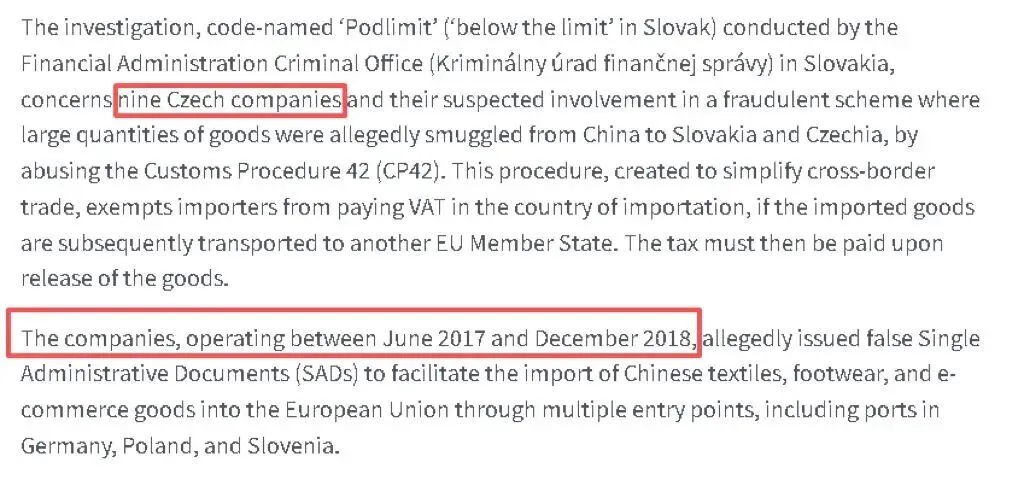 EPPO通报显示,此次代号为“Podlimit”的调查由斯洛伐克金融管理局刑事办公室主导,涉案主体为9家捷克公司。这些企业被指控利用欧盟海关程序42(CP42)的漏洞,将大量中国货物走私至斯洛伐克和捷克。