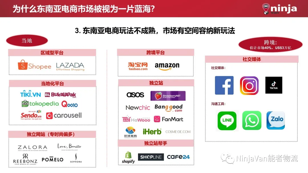 在不断扩大的区域需求与市场规模的诱惑下,面对东南亚市场的机遇与挑战,中国卖家该何去何从?能者物流从供应链与跨境物流的角度切入,为企业详细介绍了东南亚这片电商蓝海。 为什么东南亚电商市场被视为一片蓝海? 滑动查看更多 世界那么多物流公司,为什么搞不定东南亚? 滑动查看更多资讯 品牌卖家、制造商上线东南亚,该如何选择平台? 滑动查看更多图片