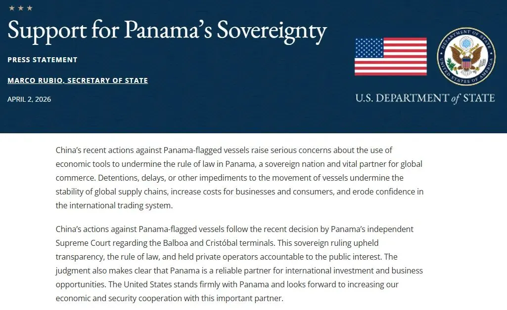 4月2日,美国国务卿马尔科·卢比奥发表声明,对中国近期在港口扣押巴拿马籍船舶的行为表示谴责。称美国将与巴拿马站在一起,反对任何针对其主权的报复性欺凌行为。
