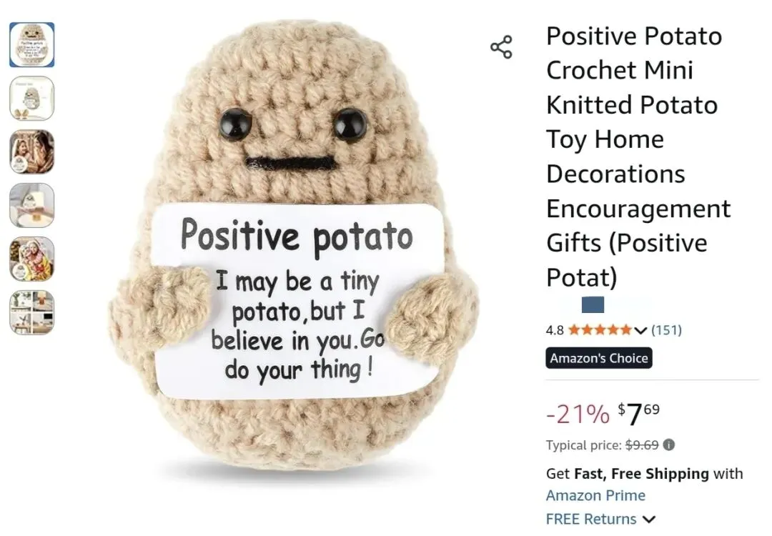 原告为中国跨境卖家,专注毛绒玩偶与针织文创产品,主打正能量励志风格。持有Positive Potato积极土豆商标,以可爱针织土豆玩偶为核心爆款,产品覆盖抱枕、钥匙扣、解压玩具等,畅销海外电商平台。