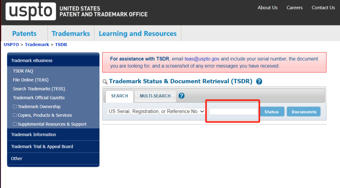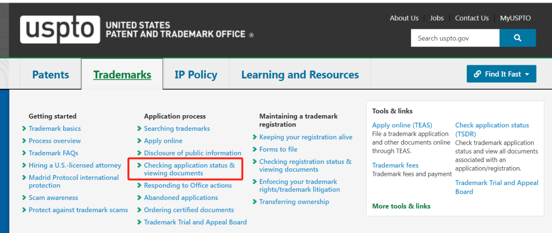 (1)需要登陆美国商标专利局的网址:https://www.uspto.gov/,然后点击「Trademarks」栏目下的「Checking application status&viewing ducuments」