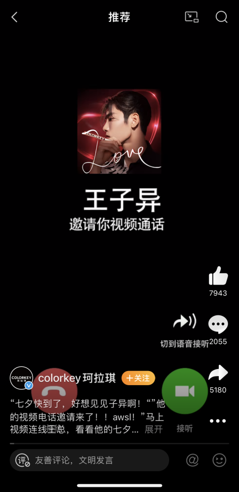 2020年,上线代言人王子异七夕宠粉告白视频。