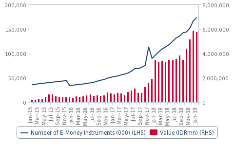 36家持牌电子货币发行人(截至2019年2月)可分为三类:运营商主导,银行主导和独立发行人。 目前,两个独立参与者和一个以运营商为主导的服务占据市场,分别是:Go-Pay,OVO和TCash。
