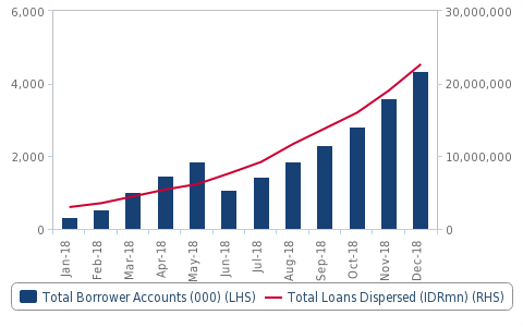 根据OJK的统计数据显示,2018年底P2P借贷总额高达22.6万亿印尼盾,高于2018年1月的3万亿印尼盾。2018年不良贷款率保持相对稳定,全年平均为2.4%。2018年1月至12月期间,借款人账户数量也增加了1220.4%。