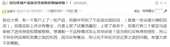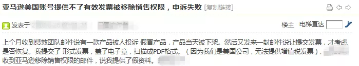 账号因不真实投诉被移除销售权限。这种情况有卖家猜测应该是被买家或其他卖家投诉产品的真实性,被亚马逊认定为账号不真实,存在销售不真实产品的问题。具体原因,该卖家并没有说明清楚,但是还是要给其他卖家提个醒,多留意一下。