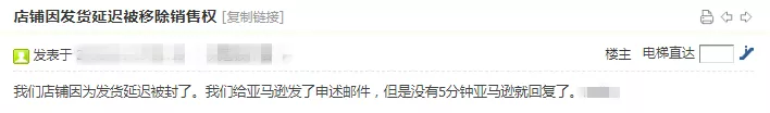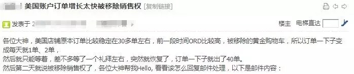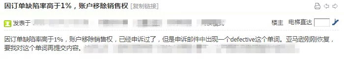 这位卖家因订单缺陷率高于1%,被移除销售权。订单的缺陷率和迟发率一样,出现超过亚马逊规定的指标(订单缺陷率必须小于 1%),会影响卖家账号的表现。如果卖家没有及时做好调整处理,出现被亚马逊移除销售权的可能性很大。
