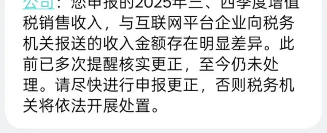 与前几次不同,这次措辞明显更硬:直接指出申报收入与平台报送金额存在明显差异,并明确提到"已多次提醒,若继续不处理将依法处置"。