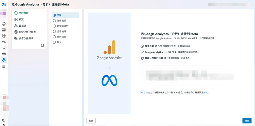 在开始安装之前,广告主需要拥有一个Google Analytics账户(需要具有 Google Analytics(分析)账户的访客或更高级别的访问权限),以及需要准备好电子邮件和密码,以便在设置过程中登录Google Analytics。除此以外,还需要对Meta商务管理平台拥有完全控制权。
