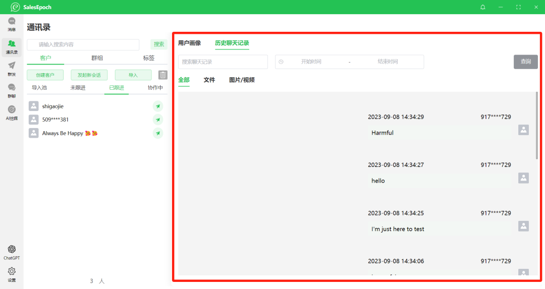 Social CRM:在客户画像栏目内即时展示来源、标签、画像、跟进记录等信息,支持边沟通边查看,实时同步客户最新动态(如社交互动、行为轨迹)。例如,客服与客户沟通时,可同步看到其在历史跟进记录,快速匹配沟通策略,让客户管理从 “静态档案” 升级为 “动态雷达”,大幅提升营销效率。