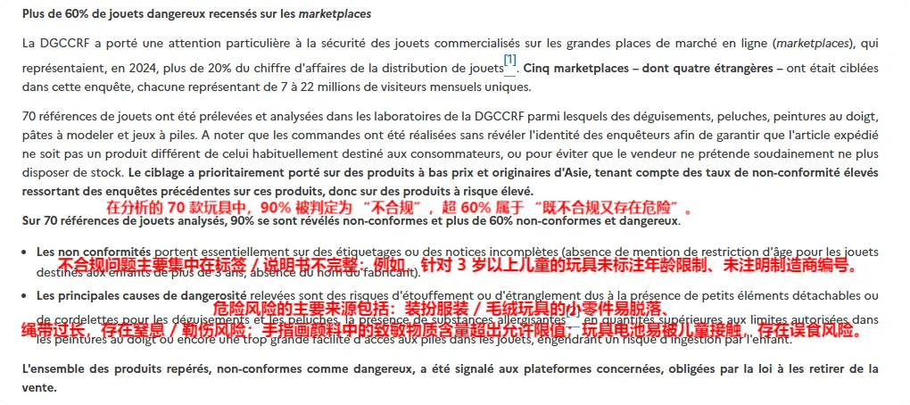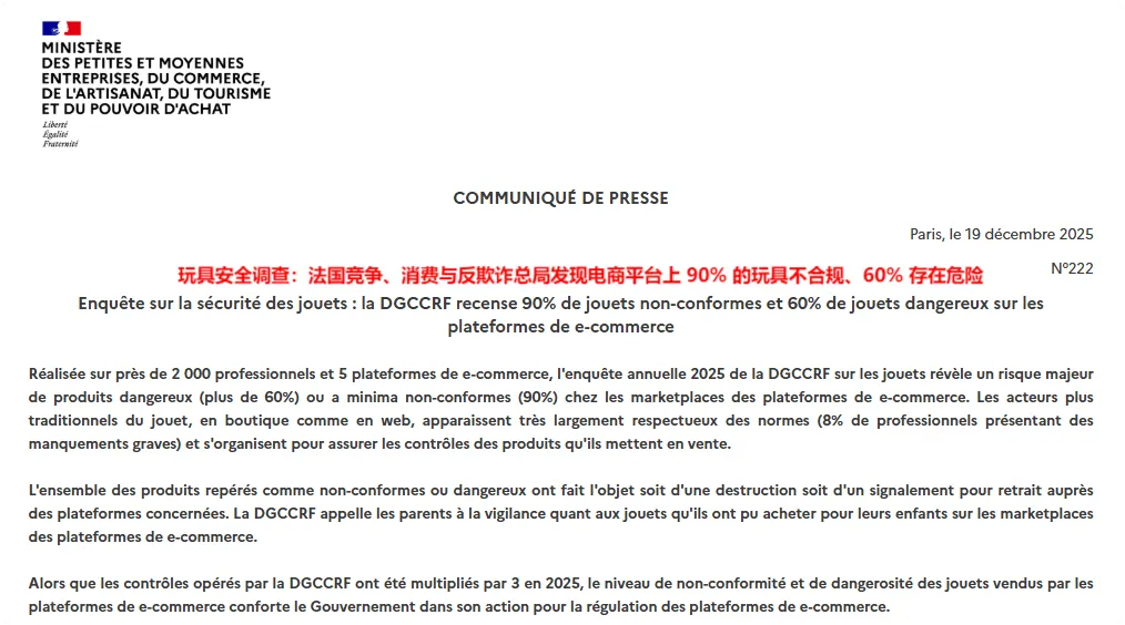 法国DGCCRF在其年度玩具安全调查中,将矛头直指线上销售渠道。覆盖近2000家玩具经营主体及5家月访问量巨大的主流电商平台,其中4家为跨境平台。