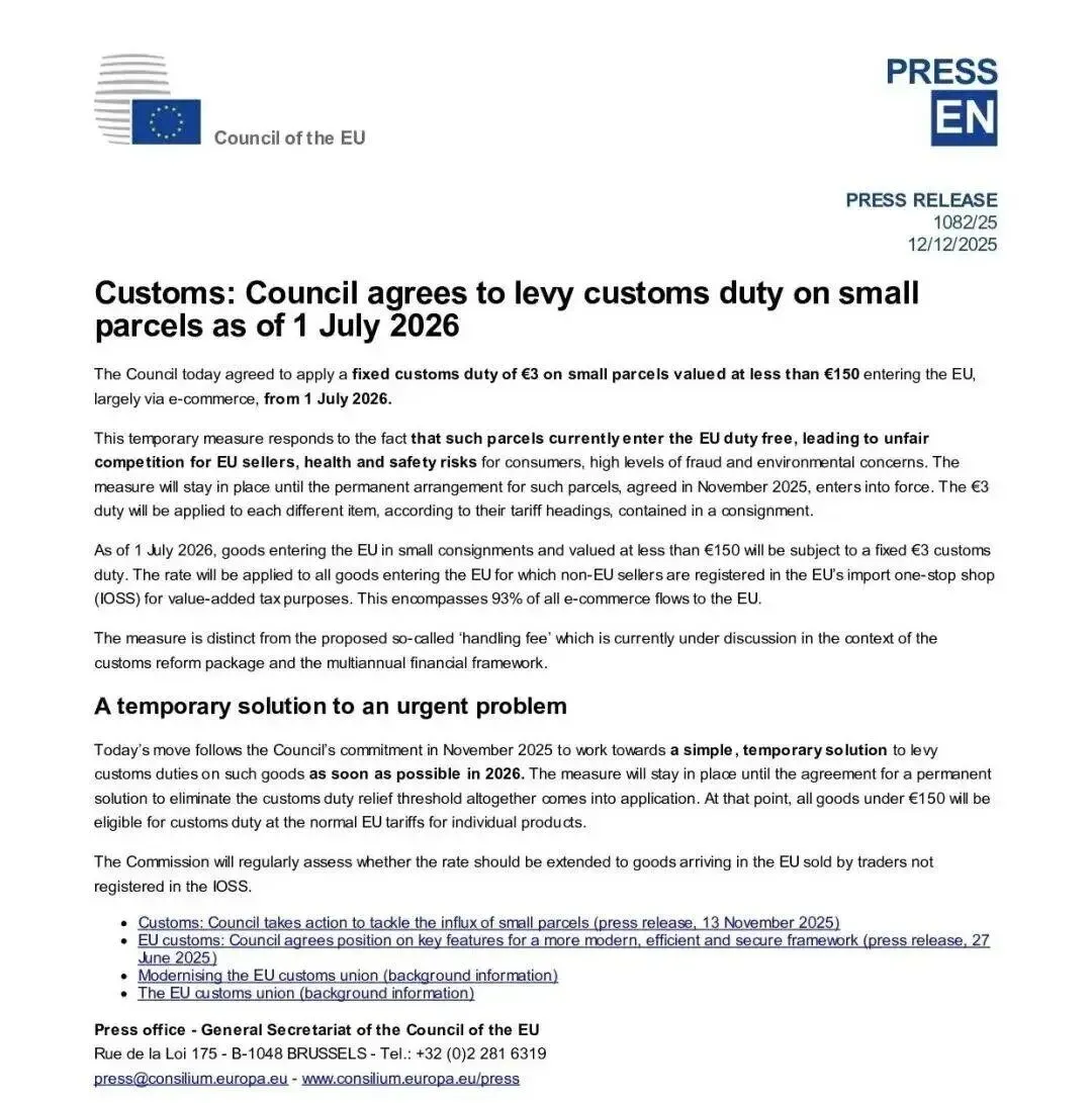 与此同时,欧盟宣布2026年7月1日起对低价值包裹征收每件3欧元的固定关税,加上即将取消的小额包裹增值税豁免政策,欧洲市场正在构建一张严密的税务监管网。