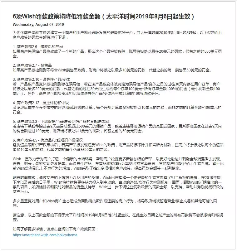 同样是因为平台整体交易环境在不断改善,Wish的政策也需要从限制违规行为向引导合规行为的转变,因此,对于政策2.12也做出了下调罚款金额的调整。