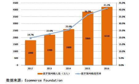 俄罗斯是欧洲互联网用户最多的国家,有超过 1 亿的网民,2016 年互联网普及率达到 71.3%,是金砖五国中互联网普及率最高的国家。2016 年,俄罗斯网购人数超过 4000 万,网购使用率达到 41.2%。