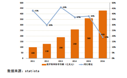 2016 年,俄罗斯网络零售业务增长显著,网络零售额达到 430 亿美元,按卢布计算较 2015 年增长 19%,其中实物销售额为 120 亿美元,占网络零售总额的 28%。俄罗斯的网络零售占零售市场总额的比重仅有 1.3%,俄罗斯的网络零售还有相当大的增长空间。