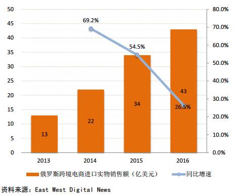 2016 年俄罗斯跨境电商进口实物销售额为 43 亿美元,比 2015 年增长26.5%。俄罗斯轻工制造业较为薄弱,通过跨境电商平台,俄罗斯消费者可以购买到国外物美价廉的商品。跨境电商已经成为俄罗斯电子商务市场的主要增长驱动力量之一。