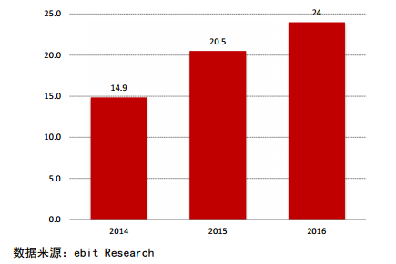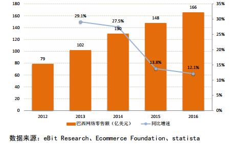 2016 年巴西网络零售额达到 166 亿美元,相比 2015 年增长 12.1%。预计 2017年巴西网络零售规模将达到 187亿美元,同比增长 12.8%,但近几年其网络零售增速总体上持续下降。