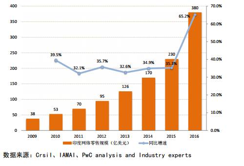 过去十年间,由于互联网和移动终端的普及,印度电子商务实现了持续快速发展。2009 年印度网络零售市场规模仅为 38 亿美元,到 2016 年快速发展到约 380 亿美元,年复合增长率达到 39%。