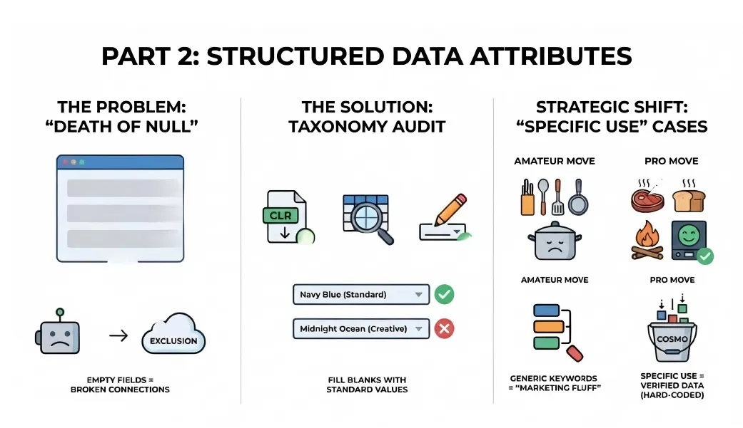 你卖的是铸铁煎锅,却在“烤箱适用温度”这一栏留空。那么当用户询问 Rufus“这个煎锅能放进 500 华氏度的烤箱吗?”时,Rufus 无法给出确切答案。哪怕你在商品要点里写了“可承受 500 华氏度烤箱温度”,Rufus 还是会优先采信结构化字段的信息——因为那是经过验证的数据,而商品要点在它眼中只是“营销话术”。