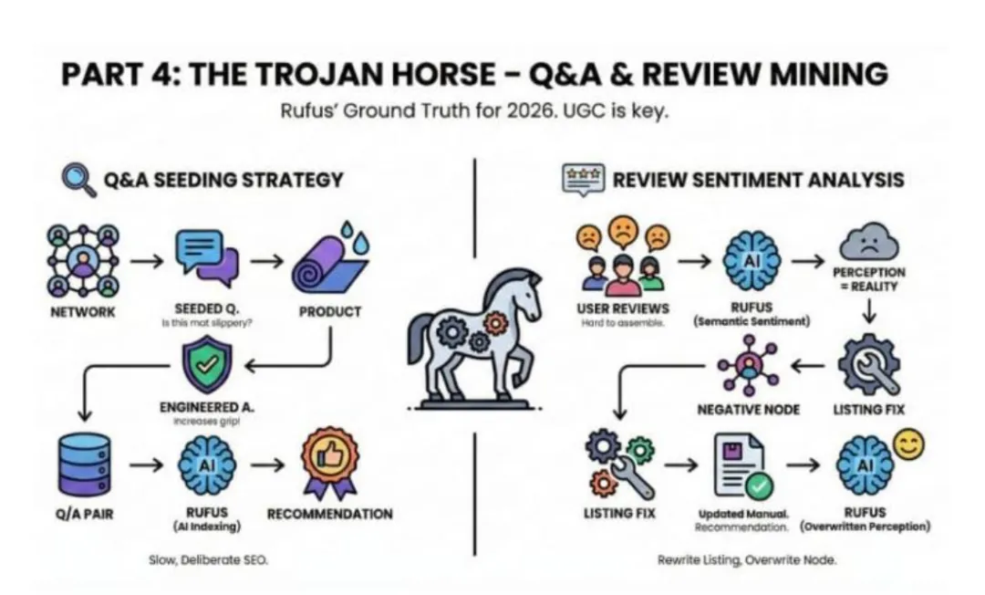 Rufus更相信买家的UGC内容,而非卖家的自卖自夸,评论和问答是影响算法推荐的核心板块,也是无需改商品就能优化的关键抓手。