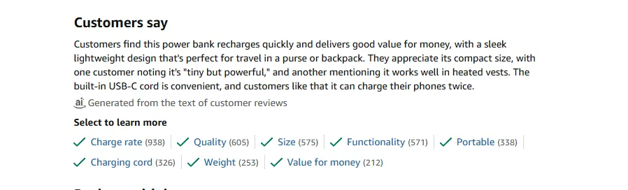 当用户问 Rufus “能带上飞机的充电宝”,AI 会直接提取这个问答对生成推荐语,精准匹配这类出行场景的需求。