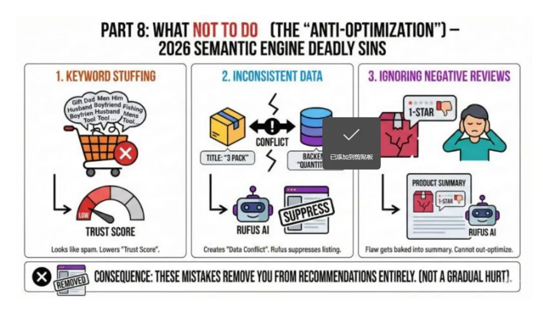 Rufus 的语义算法零容忍这些错误,触碰任何一条,不是流量下滑,而是直接被排除在推荐清单之外: