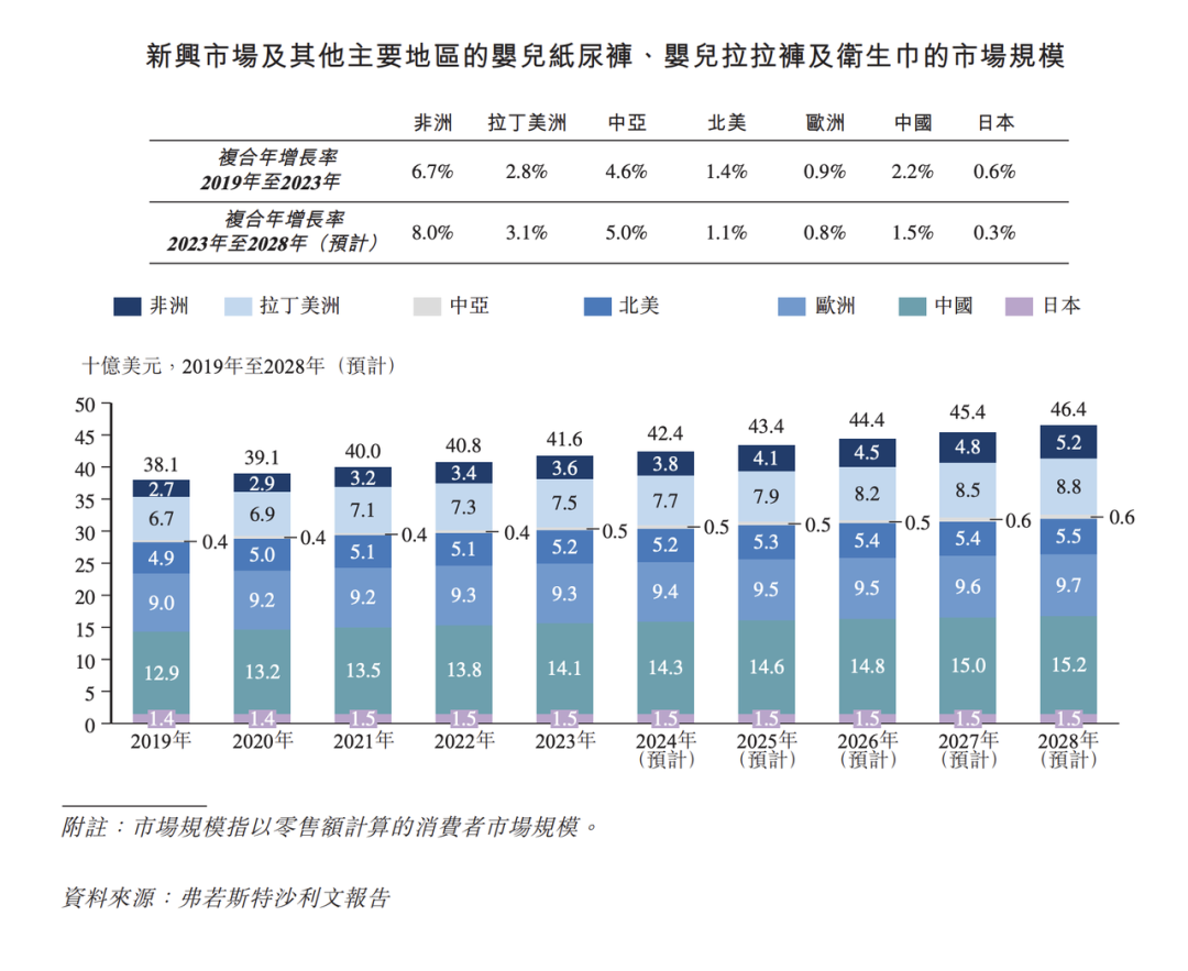 非洲是全球全球增长最快的婴儿纸尿裤、拉拉裤及卫生巾市场,这得益于高生育率和卫生用品的低渗透率。2023年,市场规模达36亿美元,年复合增长率为6.7%。预计2028年市场规模将达52亿美元,年复合增长率为8%。