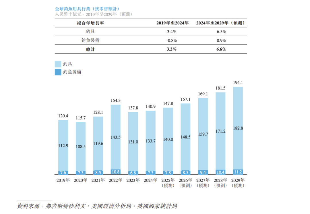 根据弗若斯特沙利文,2024年全球钓鱼用具行业的市场规模达到1409亿人民币,2019-2024年复合增长率为3.2%。其中又分为两个大类:钓具产品(如鱼竿、渔轮、鱼钩、鱼线、鱼饵等必备产品)和钓鱼装备产品。和乐欣目前主要所在的装备市场相比,钓具产品等市场规模更加可观。