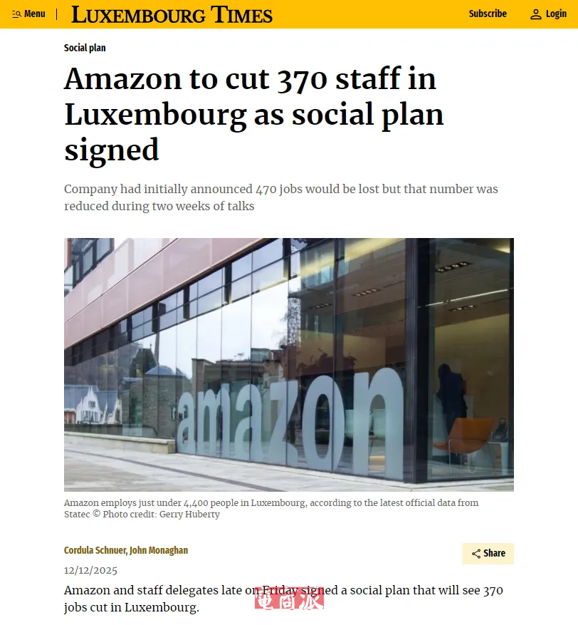 亚马逊计划在卢森堡欧洲总部裁员370人!