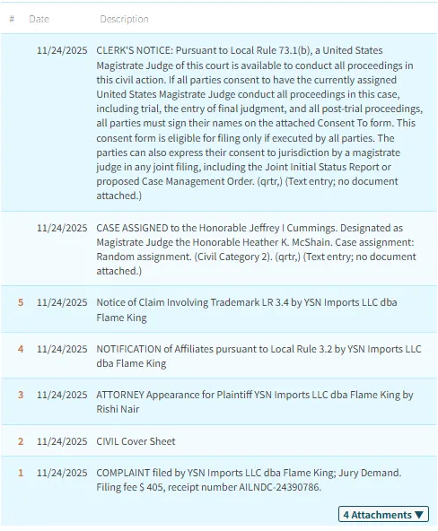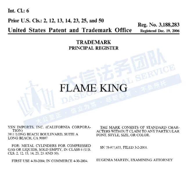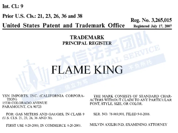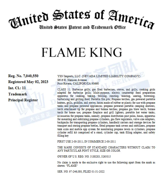 此案商标维权,关键词:flame king,注意!目前有被告店铺共35家,以下是相关商标具体信息,未经授权不得擅自使用,跨境卖家尽快检索下架,否则会有TRO侵权风险!