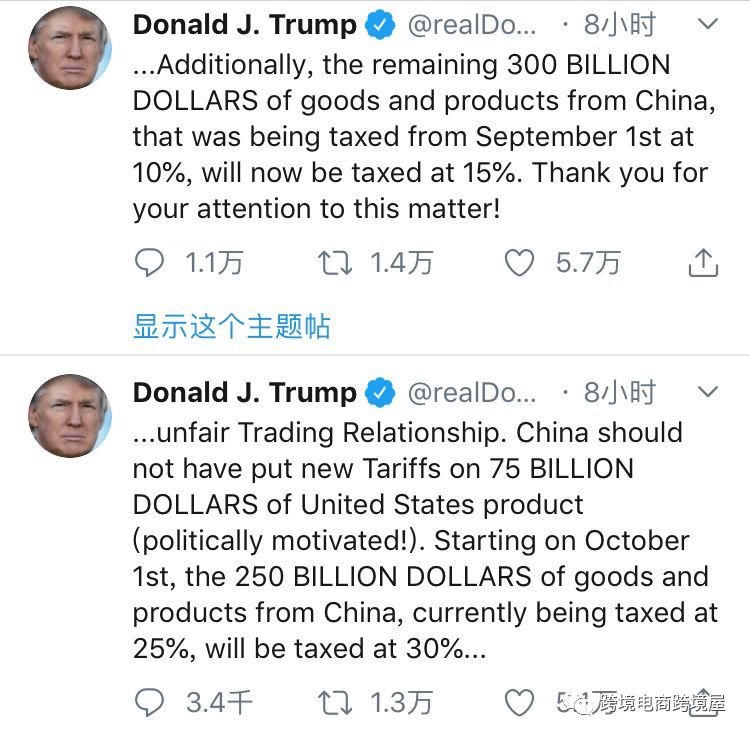 8.23日,美国总统特朗普通过推特表示,美国将在10月1日将2500亿美元中国商品的现有加征关税从25%提高至30%;定于9月1日生效的另外3000亿美元中国商品的关税从原计划10%提升至15%。并叫嚣着中国是美国最大的敌人!之前他一直强调美联储是美国最大敌人。