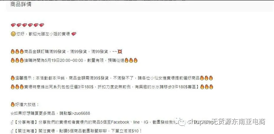 其次就是产品描述,shopee没有详情图,但是有描述,这一步非常的重要,一个好的描述可以直接促成转化,使消费者更具吸引力,但最重要的是产品的卖点。Shopee的详情页不同于国内电商的详情页,在我们国内详情页肯定是做的满满当当的,包括图片设计,产品介绍设计等,要求都十分高,但是在shopee上你去看看会发现,详情页里没有什么图片设计的,只是以文字的形式介绍产品功能,把发货的内容大概说一下。