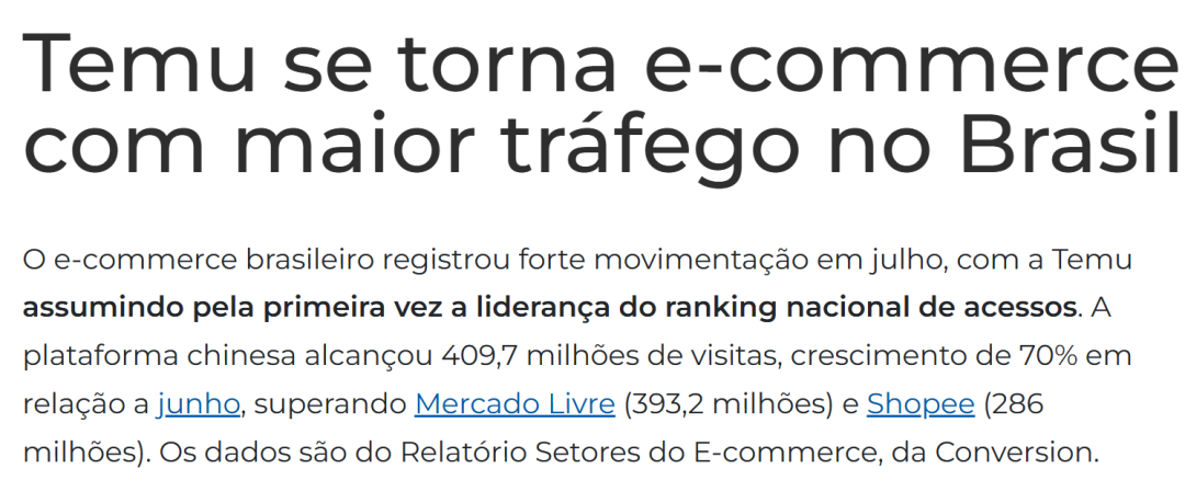 在这场激烈的竞争中,各大电商平台都使出了浑身解数,试图在这片充满潜力的市场中占据一席之地。而在这股强劲的增长态势中,拼多多旗下的Temu平台表现尤为突出,访问量高达4.097亿次,相较于6月份实现了惊人的70%增长,一举超越美客多(3.932亿次)和Shopee(2.86亿次),首次问鼎巴西电商访问量排行榜榜首。