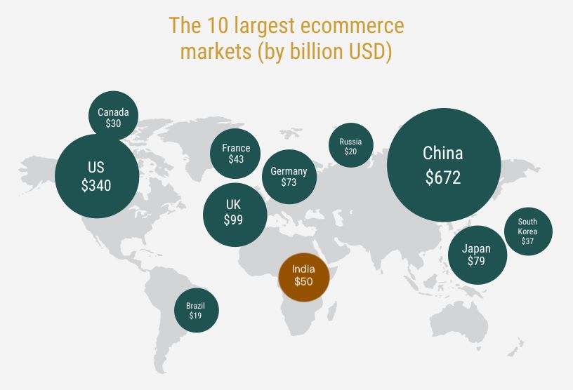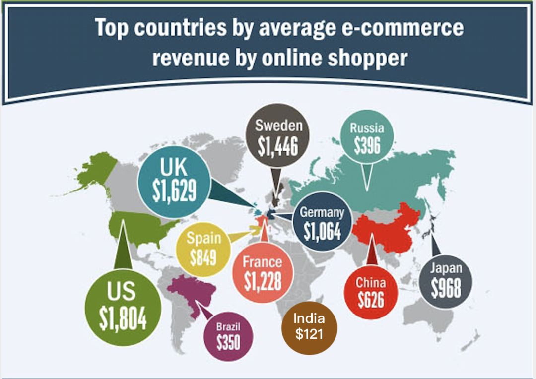 大家都知道印度和中国的人口基本相当,大约都在13亿左右,这会让许多人认为印度电商市场与中国市场一样巨大。而通过以下数据和图片,大家应该可以看到,这种认识显然是错误的: