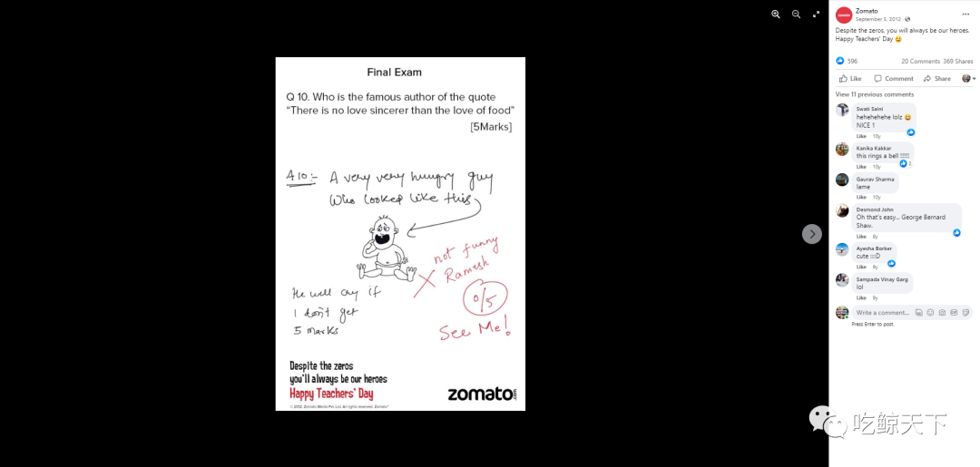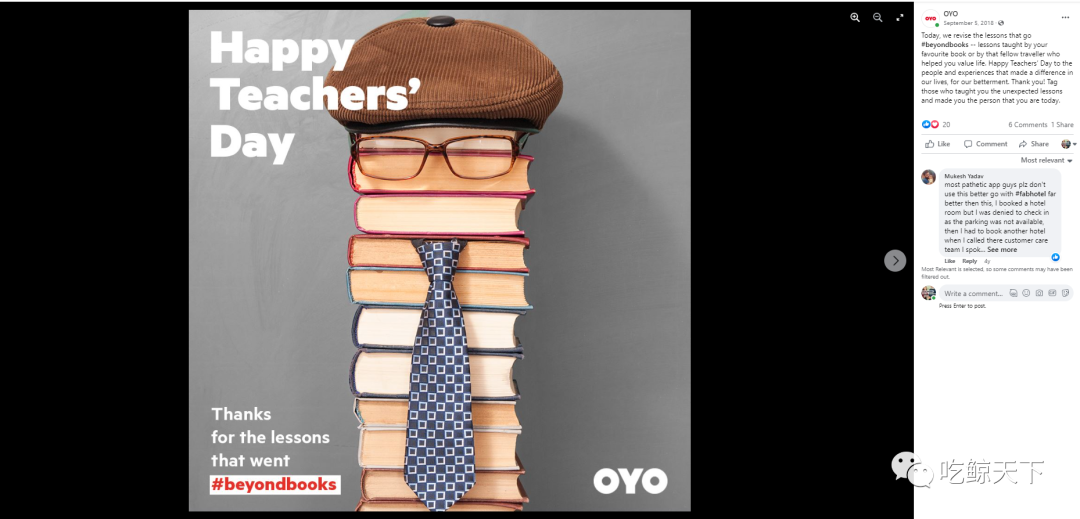 @oyo在Facebook上用其业务#beyondbook的书、帽子、领带、眼镜拼成了一个老师的模样,整个创意别出心裁但又一目了然。在庆祝教师节的同时还推广了其业务,一举两得。
