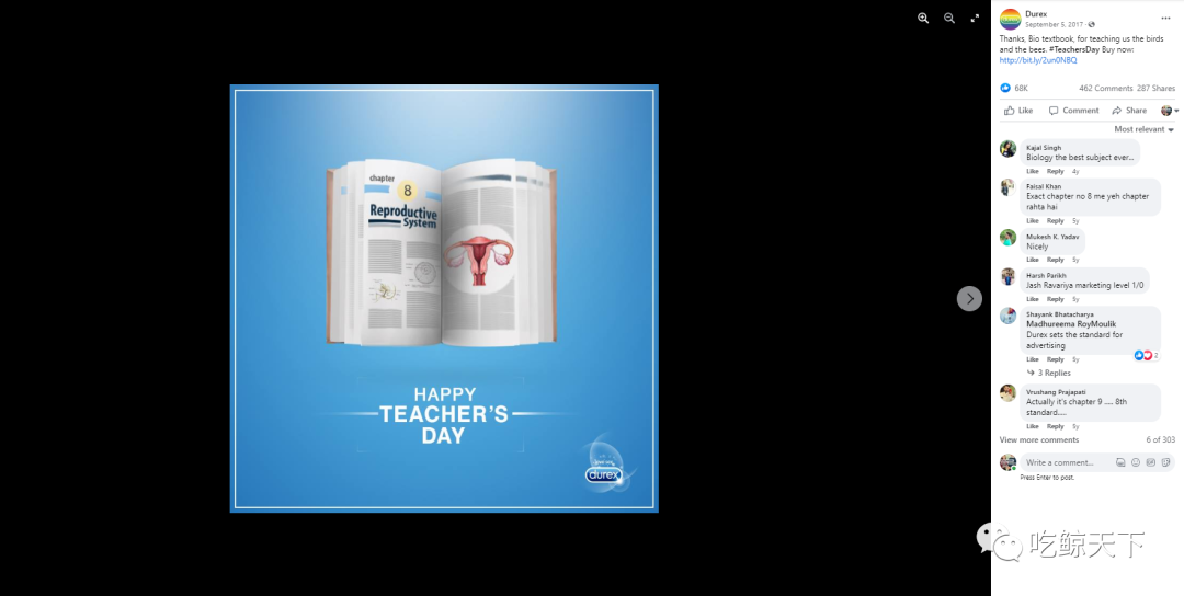 杜蕾斯我们都知道算是营销界的鬼才了,教师节杜蕾斯当然也没有落下。其发布的帖子配图采用其产品的主色调,中间一本翻开显示生理知识的书本,让人一下子就能知道这是杜蕾斯的内容。而配文“Thanks, Bio textbook, for teaching us the birds and the bees”则进一步加深了其与教师节的联系。