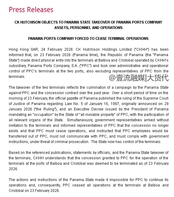 据长江和记声明表示,2026年2月24日,长江和记实业有限公司(“长江和记”)获悉,于巴拿马时间2026年2月23日,巴拿马共和国(“巴拿马政府”)直接派员强行进入由长江和记之附属公司巴拿马港口公司所运营的巴尔博亚港和克里斯托瓦尔港两个集装箱码头,并接管上述两座港口码头的行政管理及运营控制权,同时将巴拿马港口公司代表驱逐出码头区域,禁止巴拿马港口公司之代表进入该两个集装箱码头。