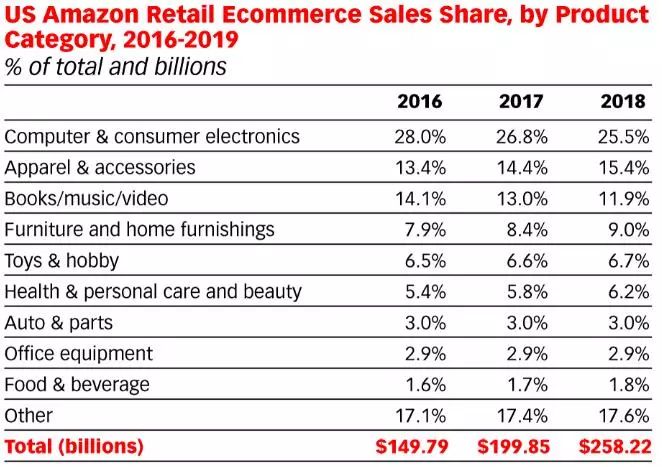 从产品类别来看,计算机和消费电子产品将成为今年美亚站上最吸钱的品类,销售额占亚马逊美国总销售额的25.5%,达658亿美元。
