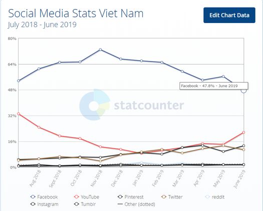 目前,在越南的社交媒体市场三大巨头依次是Facebook、Zalo、Instagram,而其他的社交媒体如Twitter、Line、WhatsApp也拥有少量的受众。但显然Facebook是当之无愧的王者,根据Social Media Stats,在过去一年中,Facebook的市场占有率远超YouTube、Twitter等,一度高达80%。