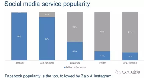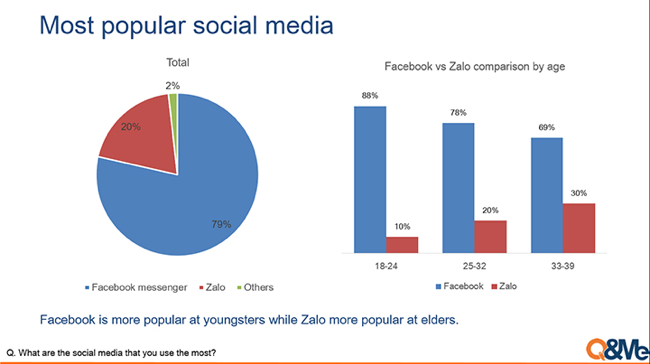 作为当地最流行的两种即时通讯和社交媒体服务之一,VNG公司旗下应用程序Zalo素有越南微信之称,根据Zalo自己的统计,一共有超过7000万人在使用这款软件,这些用户大多数是越南本土国民和海外的越南群体。不过其受欢迎群体主要以30多岁为主,Facebook Messengger则更多地被年轻一代使用,使用指数高出16%。但二者都注重亲友间的互动联结,Facebook的“News Feed”也在以这个方向调整。扎克伯格曾发脸书称,相比之下阅读新闻“只是一种被动的体验”,他们更多将考虑推送给越南用户来自朋友家人内容上“有意义的社会互动”。