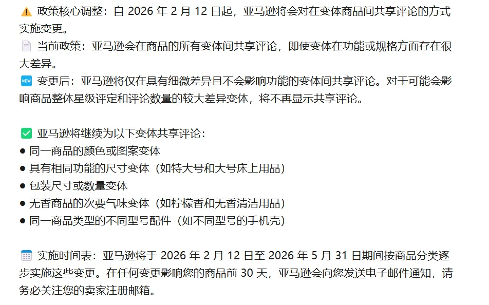 对卖家而言,变体评论不再共享,评论数与星级易下滑、新品冷启动更难,违规合并将面临 Listing 下架、账号受限风险,运营与合规成本同步上升。