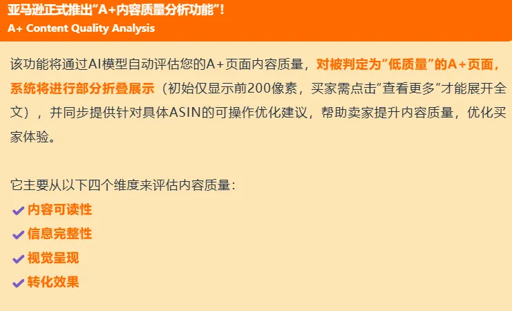 亚马逊上线A+内容质量分析功能,系统通过AI算法自动评估内容质量,不达标的内容可能被折叠,需卖家优化A+页面设计,确保内容质量和视觉效果。