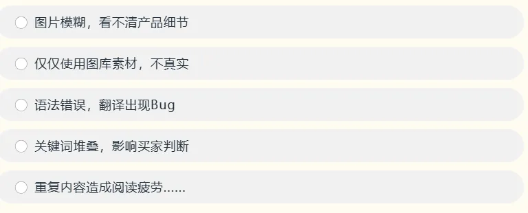 所谓的“低质量“A+页面,并不是颜值不够高,而是因为没有解决买家的疑虑。这类内容通常会存在以下的共性问题: