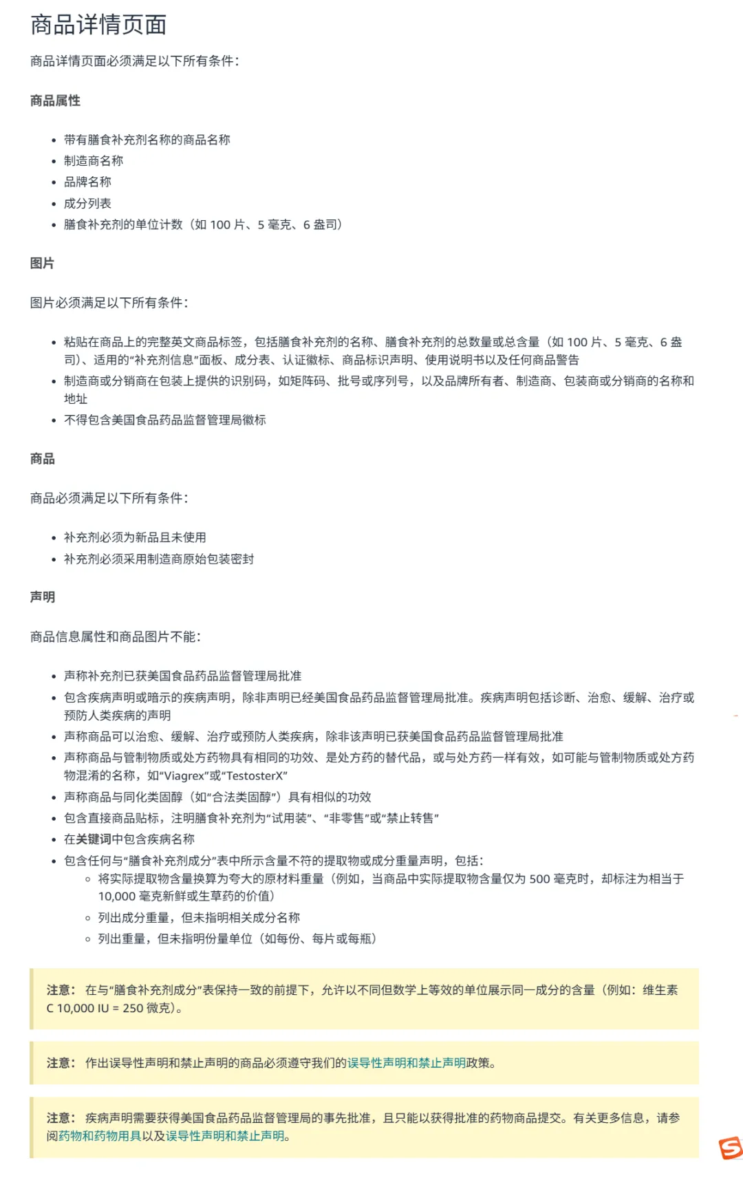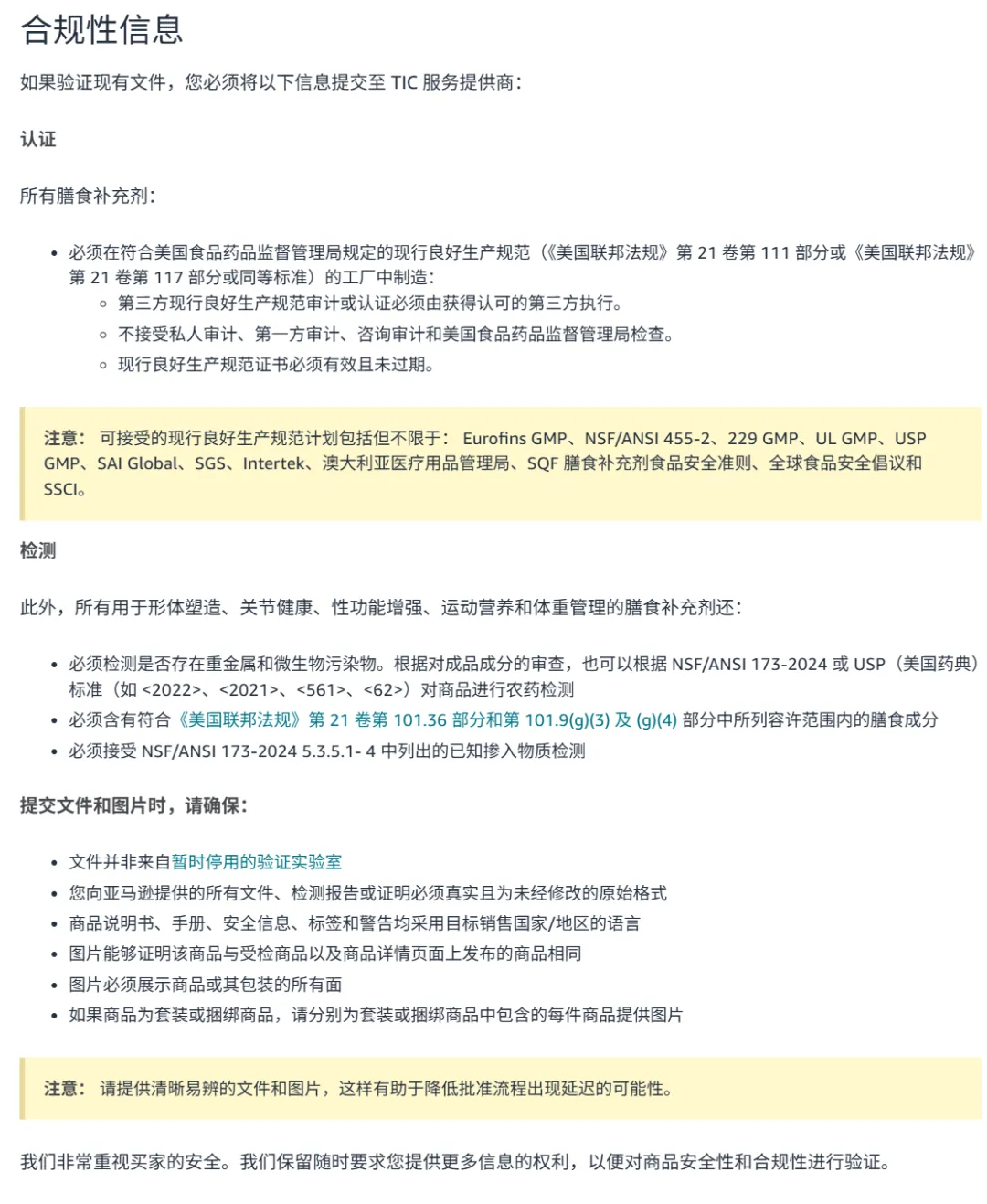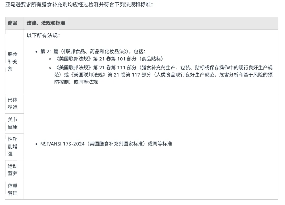 亚马逊要求所有膳食补充剂均应经过检测并符合下列法规和标准: