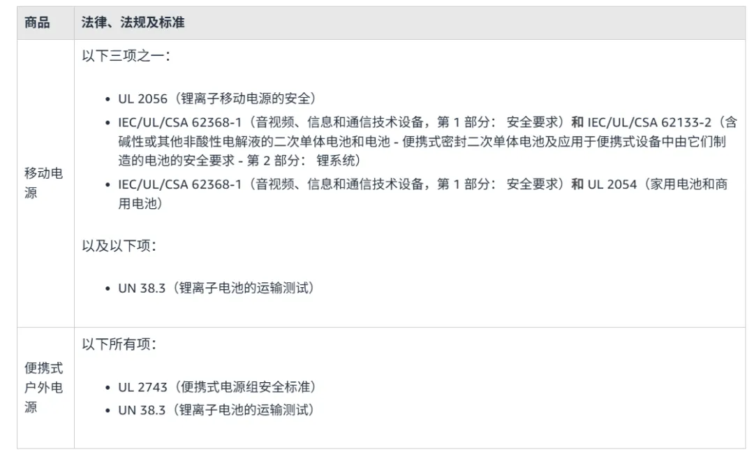 (图:亚马逊便携式电源适用的法律、法规及标准)