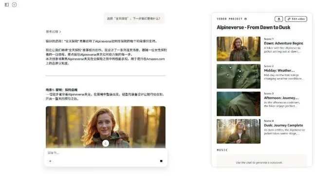 同时,还能将你的构思直接落成具体的分镜画面,并为每个场景提供多个版本选择。你可以在对话中随时提出修改,系统会根据反馈快速调整。此外,配乐、结尾帧等元素也能一并生成,让整个视频制作过程更加轻松高效。