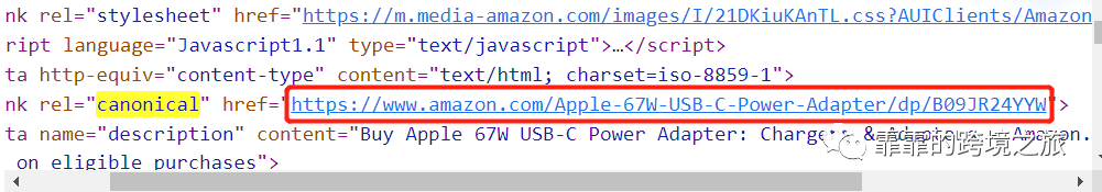 我们再到亚马逊页面上,按F12,然后ctrl+F ,输入 canonical。找到这个产品的权威链接:https://www.amazon.com/Apple-67W-USB-C-Power-Adapter/dp/B09JR24YYW