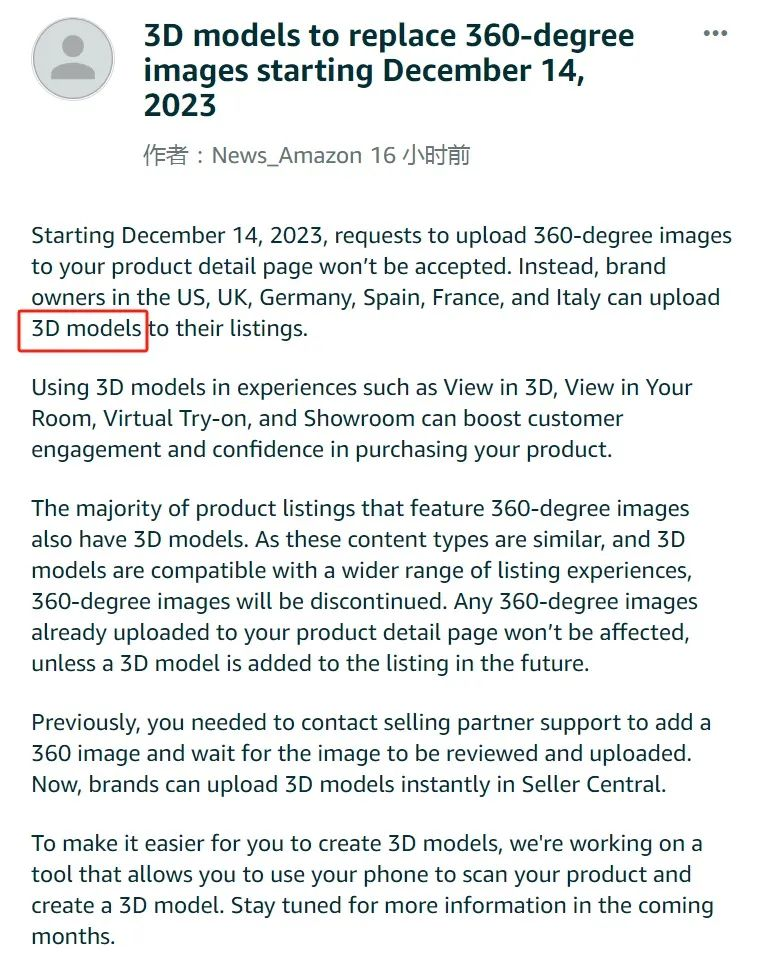 亚马逊宣布,自2023年12月14日起,不再接受上传360°图像至产品详细信息页面的请求。卖家可以添加产品的3D模型,这将对亚马逊的产品详情页面带来革命性变化。