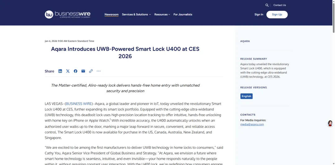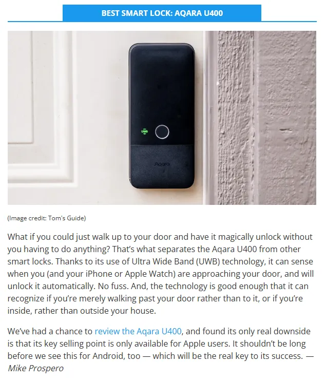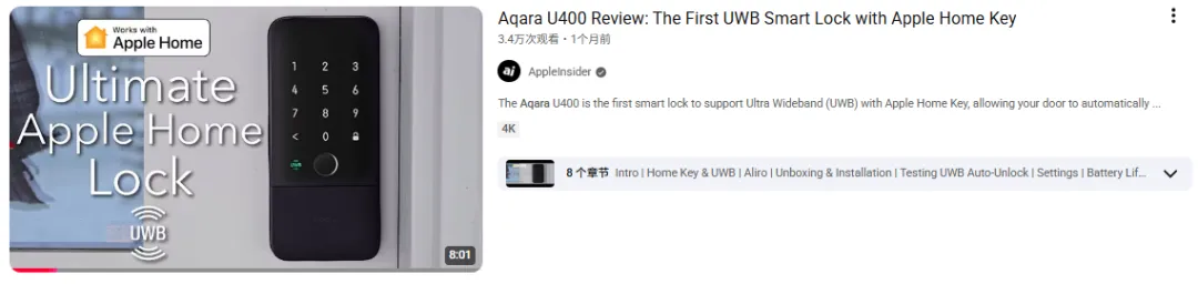 @AppleInsider 为 U400 智能门锁推出专属深度评测视频,耗时一周实测,从 UWB 无感解锁的精准度、安装的便捷性,到 Matter 协议的兼容性、续航能力,进行全维度解析,甚至客观指出 “产品体积略大于传统智能锁” 的小短板。这种真实、中立的评测,让海外用户感受到了品牌的诚意,也让 U400“全球首款 UWB+Apple HomeKey 智能门锁” 的定位深入人心。