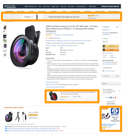 黄金广告位: 商品页的顶部横幅、五点描述下面、购物车下面、评论旁边。位置好,容易被看到。