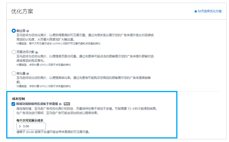 成本控制这功能,就是让你设定一个“花钱上限”(按一周平均来算)。这样你就不用再死磕算每个关键词/产品该出多少钱了,把精力都集中在搞定你的广告目标上。